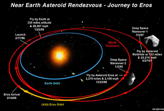 The Near Earth Asteroid Rendezvous (NEAR) mission inaugurated NASA's Discovery Program. It was the first mission to orbit an asteroid and made the first comprehensive scientific measurements of an asteroid's surface composition, geology, physical properties, and internal structure. NEAR was launched successfully on 17 February 1996 aboard a Delta II-7925. It made the first reconnaissance of a C-type asteroid during its flyby of the main-belt asteroid 253 Mathilde in June 1997. It became the first spacecraft to enter orbit around an asteroid, doing so at the large near-Earth asteroid 433 Eros in February 2000. The spacecraft, renamed NEAR Shoemaker, landed on Eros at 37.2 South by 278.4 West, ending its mission on February 12, 2001 with another spacecraft first. NEAR obtained new information on the nature and evolution of asteroids, improved our understanding of planetary formation processes in the early solar system, andclarified the relationships between asteroids and meteorites.